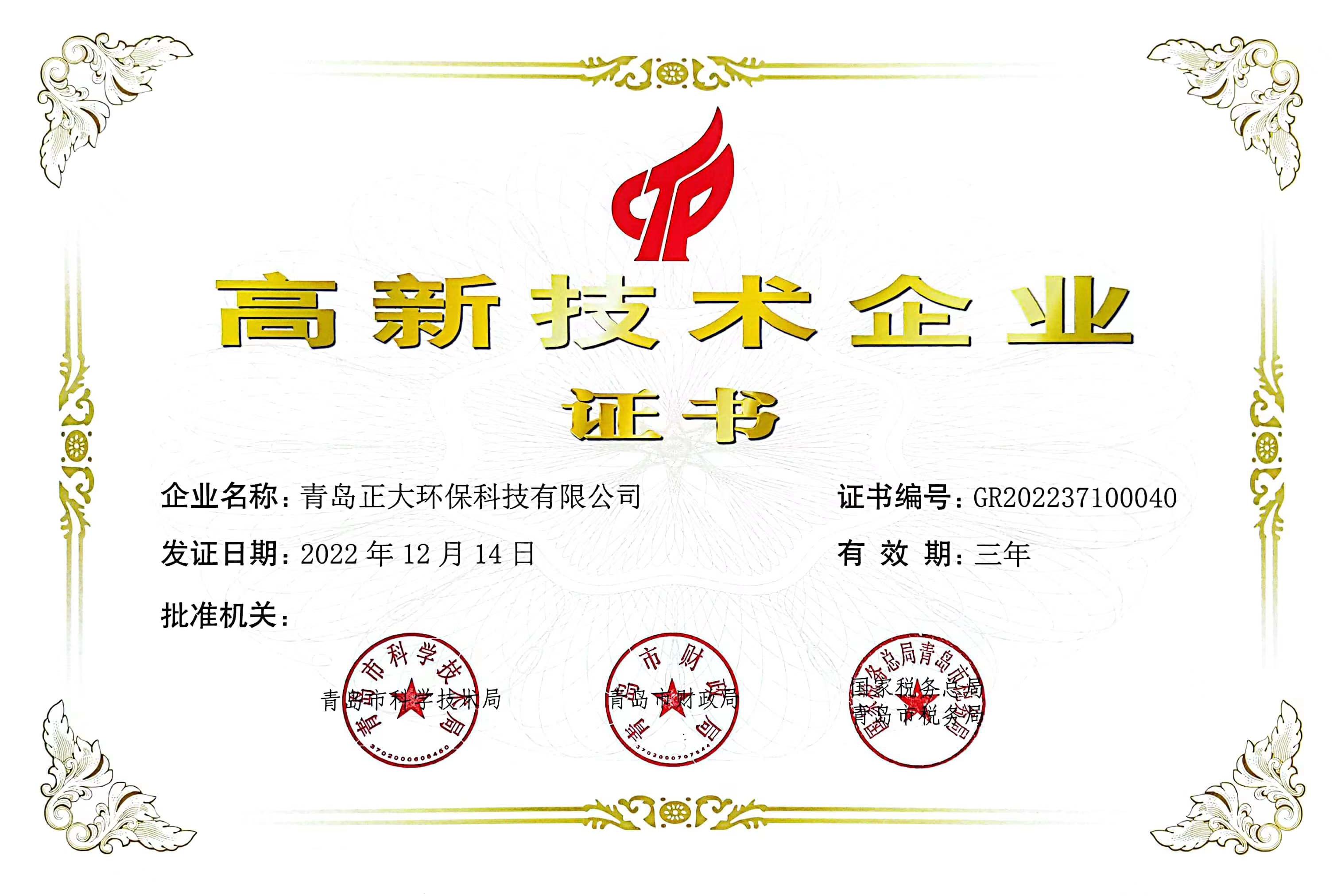 熱烈祝賀青島正大環保科技有限公司榮獲高新技術企業稱號!